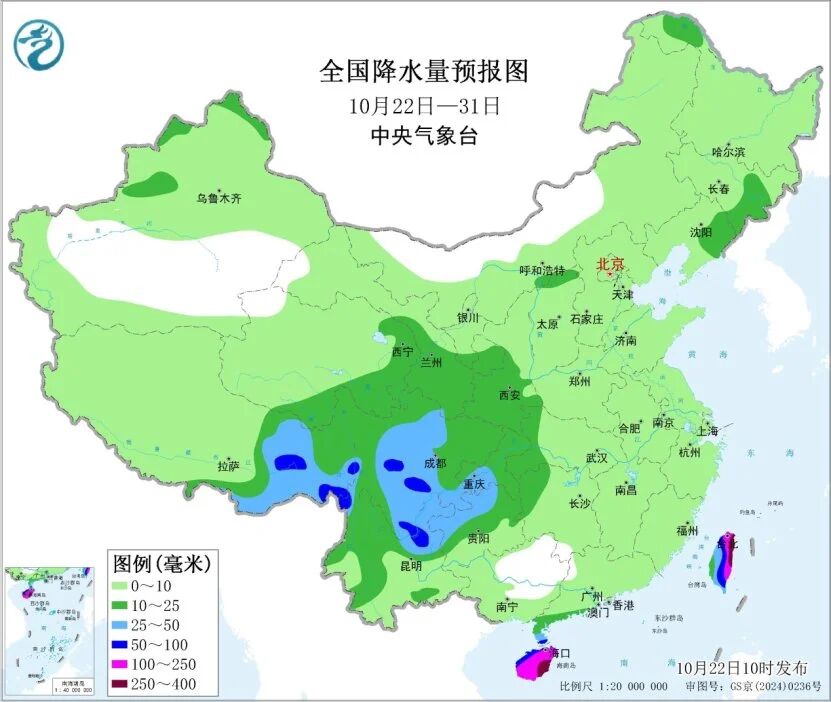 據(jù)預(yù)報(bào),未來10天(10月22—31日),西北地區(qū)東南部、西南地區(qū)大部、西藏東部等地累計(jì)降水量有10~30毫米,局部50~70毫米;華南沿海及中國(guó)臺(tái)灣地區(qū)累計(jì)降水量達(dá)30~70毫米。